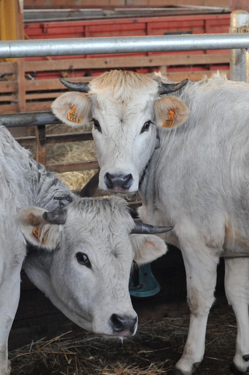 His cows are chained up for the winter – you can see the chains on the Mirandaises in the top photo. He trains the calves to the chain by letting them walk around their pen with blocks around their neck. It is a system of cow farming that I do not want to repeat, but it has worked for him for forty years. I believe there are other methods that will work better and give happier cows.