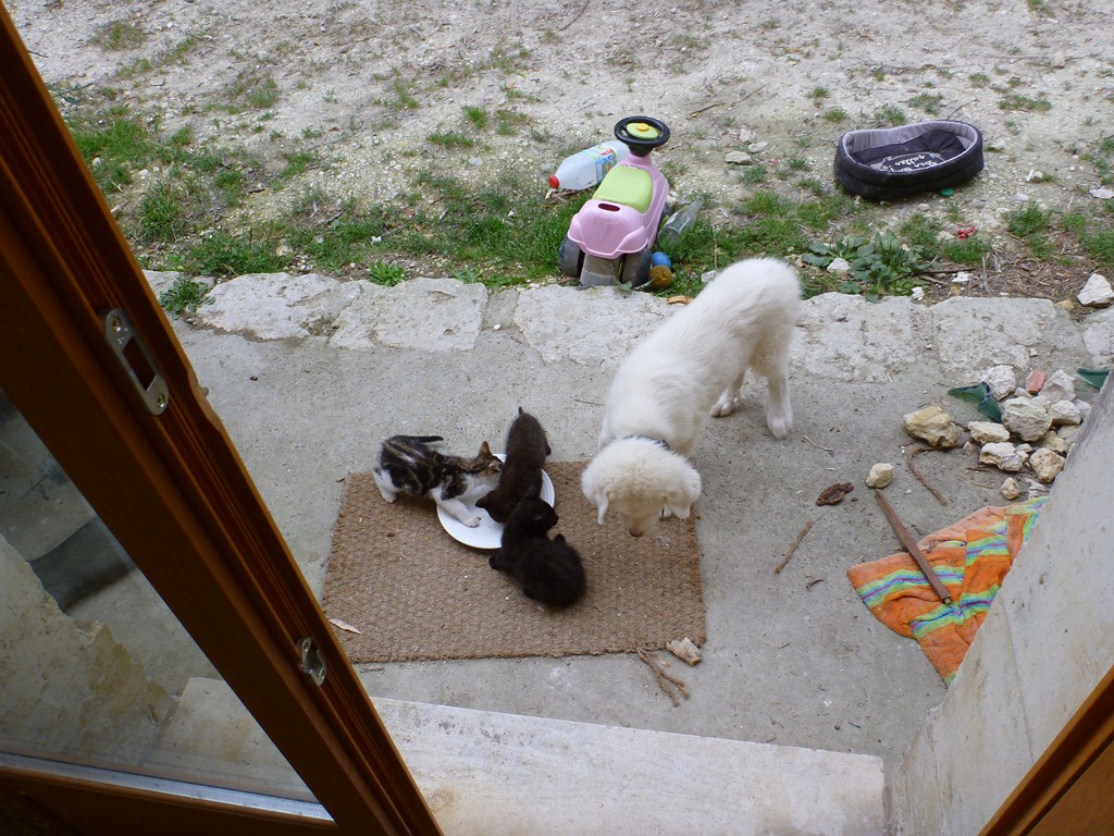 Barn kittens dominating the food and pushing out Legend the pup. They growl when they eat and are known as the piranhas. Legend gets his own back later. All the kittens end up chewed and saliva-dampened at some point.