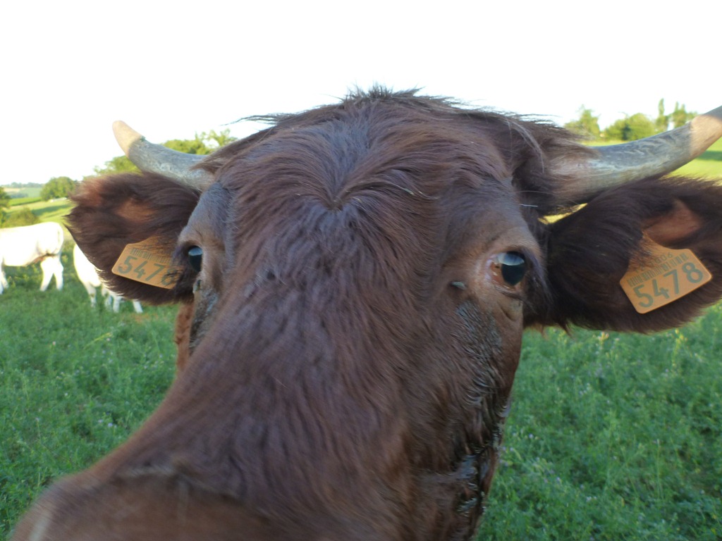 Seventy-Eight investigating the camera. The pinkish area at the base of the horns is new growth. They’re all growing new horn material fast at the moment. It might be all the high-protein lucerne they are eating. It is totally confusing me since I use horn size and color as part of cow identification.