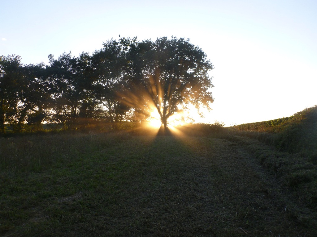The sun kept lowering until it hid behind the trunk of a tree at the edge of the farm.