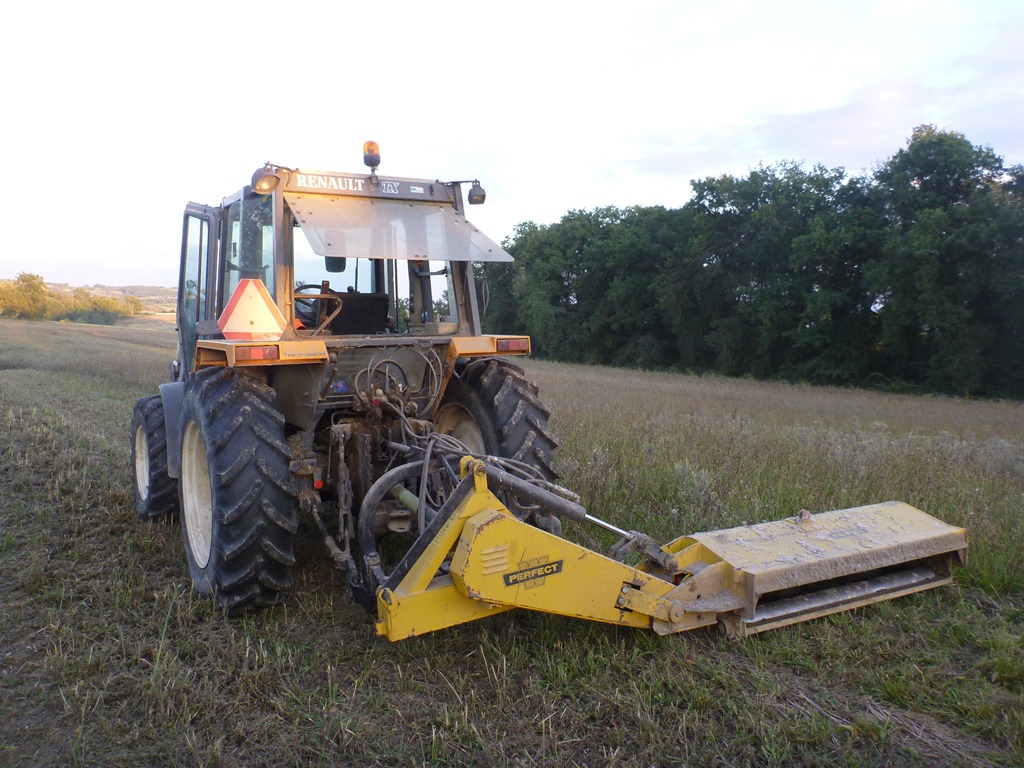 And the flail chopper (marteau broyeur, or broyeur a axe horizontale) is working again now with new belts and a tube of grease on its various moving parts. Yay! It is a Perfect ZKZ 180 made by Van Wamel and is built like a tank. It is my favorite tractor tool. Besides, that paddock had been getting out of control and needed to be cut down to size.