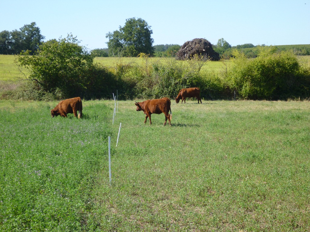 Lefty, who is a young Salers heifer and may be a lead cow one day, shows the way to the afternoon’s new slice of lucerne.