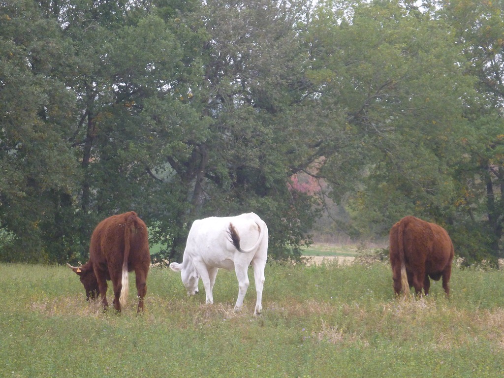 We have two cow breeds on the farm: a herd of Salers and five Mirandaise heifers. These cow breeds have some differences. Mirandaise are plains cows that like the hot sun and grow large and strong to work the ground under the vines, whereas Salers are mountain cows that give a fair amount of milk and are well protected from the cold when they put on their winter coats.