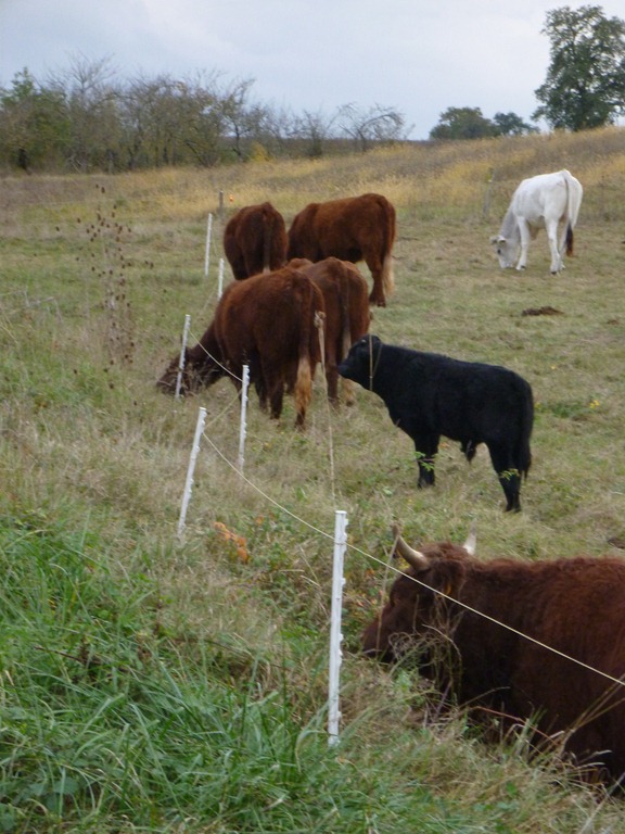 I think our calves are related to your cows. We watched Siobhan walk right through the middle of two wires today, but then she didn’t want to come back so we had to open the gate. Sara (her mother) respects the wire, and the two horses are terrified even of going through the gate! I figured out that it seems to be the ticking of the charger that scares them, so I did a little desensitization training with one of them, and the other will get her turn. I want them to respect it, but not charge through out of terror, possibly running one of us over in the process.