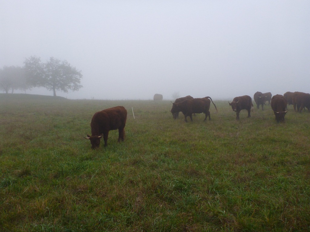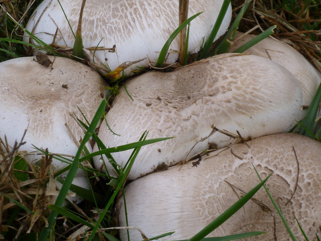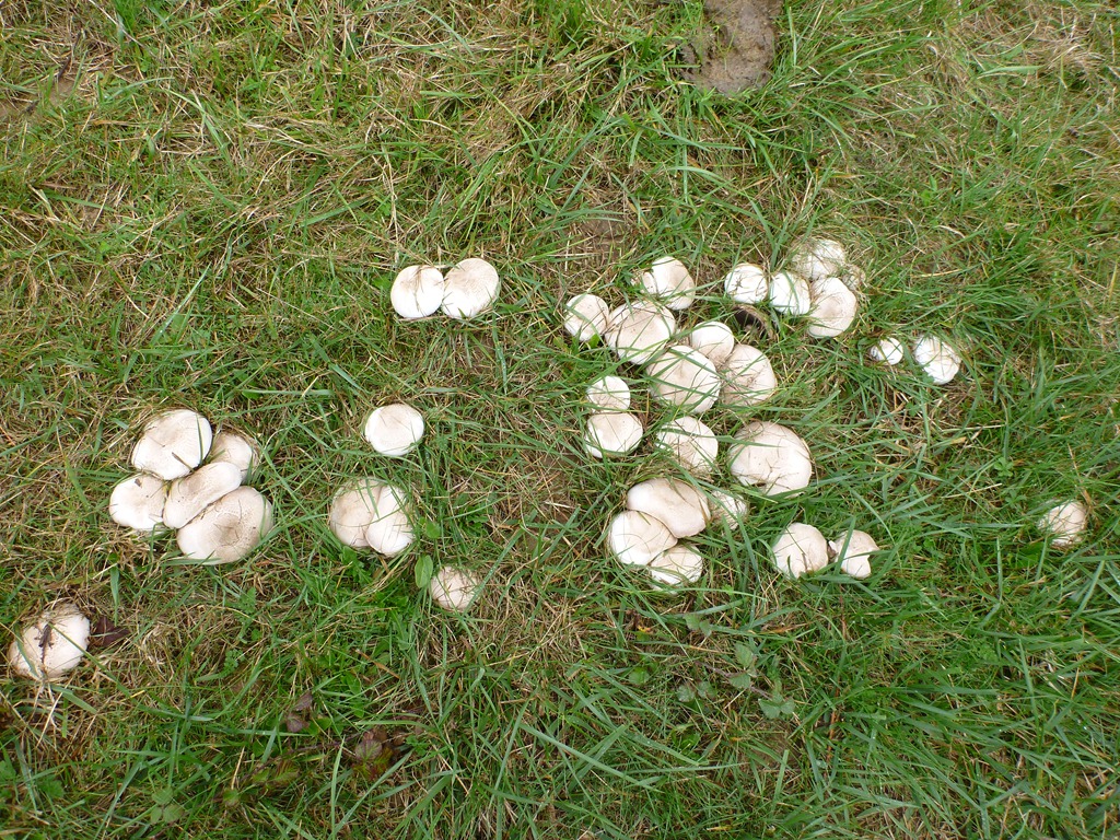 There are a lot of mushrooms in our fields. The locals call these rosé des prés, which usually means the regular old field mushrooms but there are at least two distinct species that I see. The ones below are in a fairy ring several meters across and I think they are horse mushrooms. They are way more pungent than the field mushrooms that showed up a few weeks ago, and their bunched growth looks different to the isolated field mushrooms.