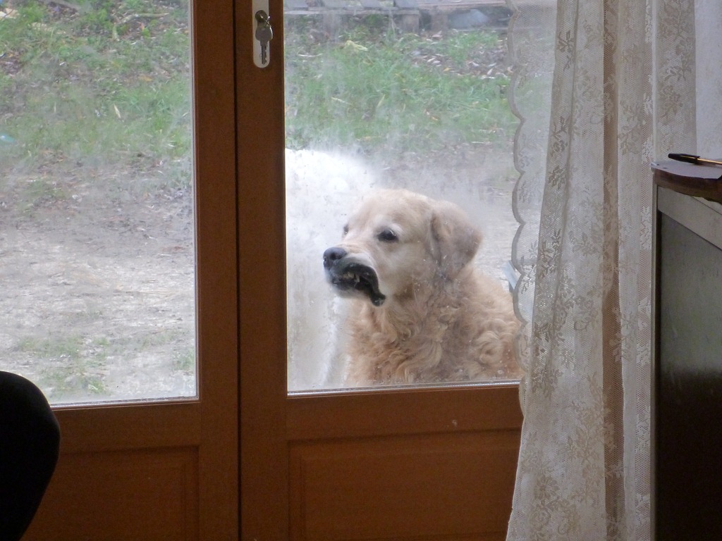 Tosca (the perpetually hungry golden retriever) likes to drool on the kitchen door. There might be a calorie or two on offer inside.