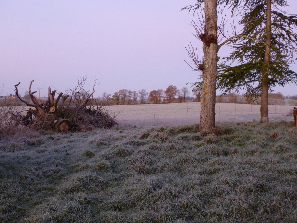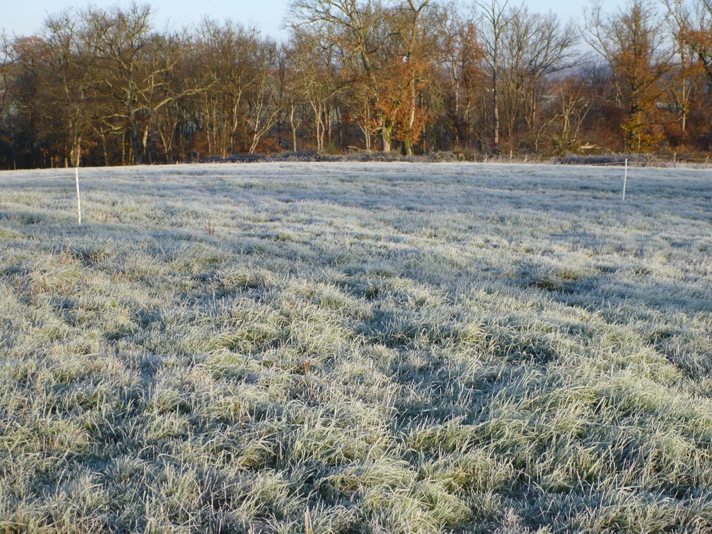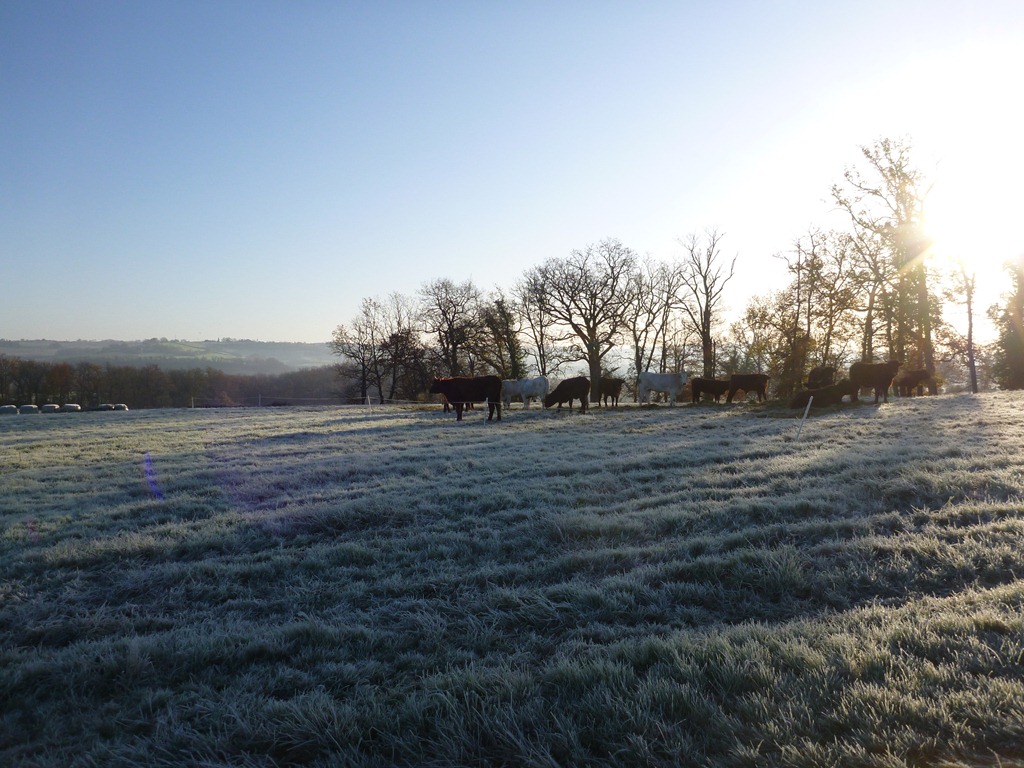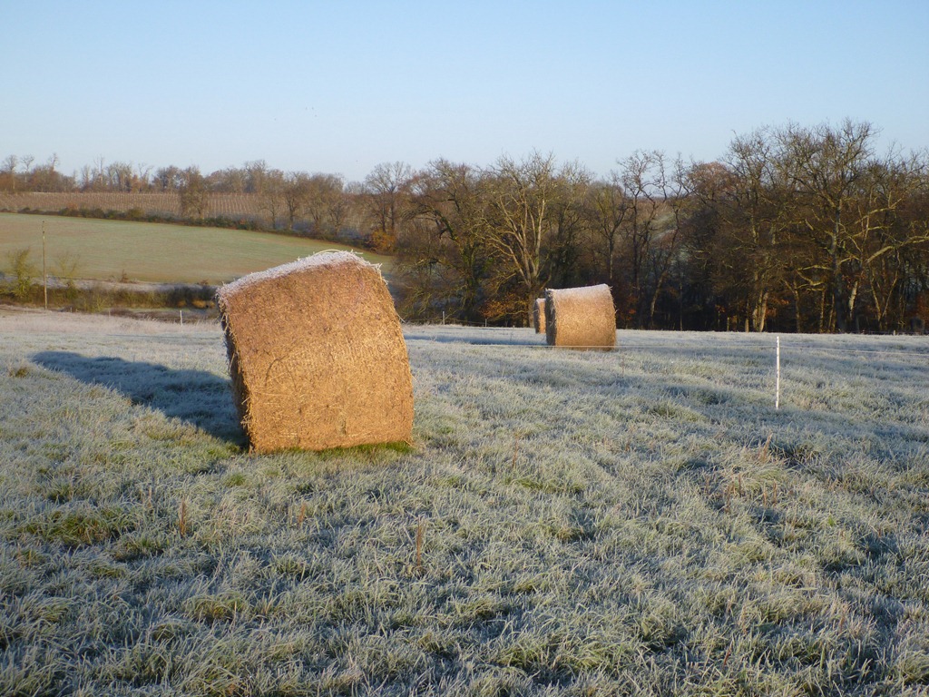 The feeder leads to circles of mud whereas rolling out the bales leads to lines of color across the fields – green, yellow or black depending on how long ago the hay was rolled out. I should take a photo, it looks rather odd.