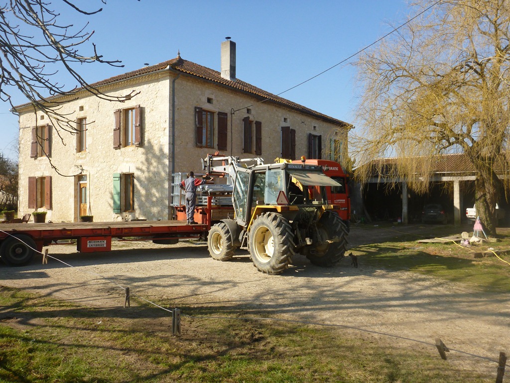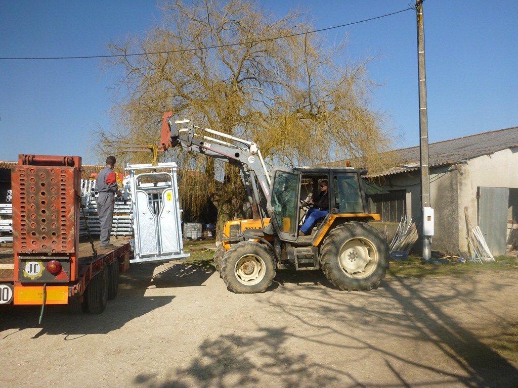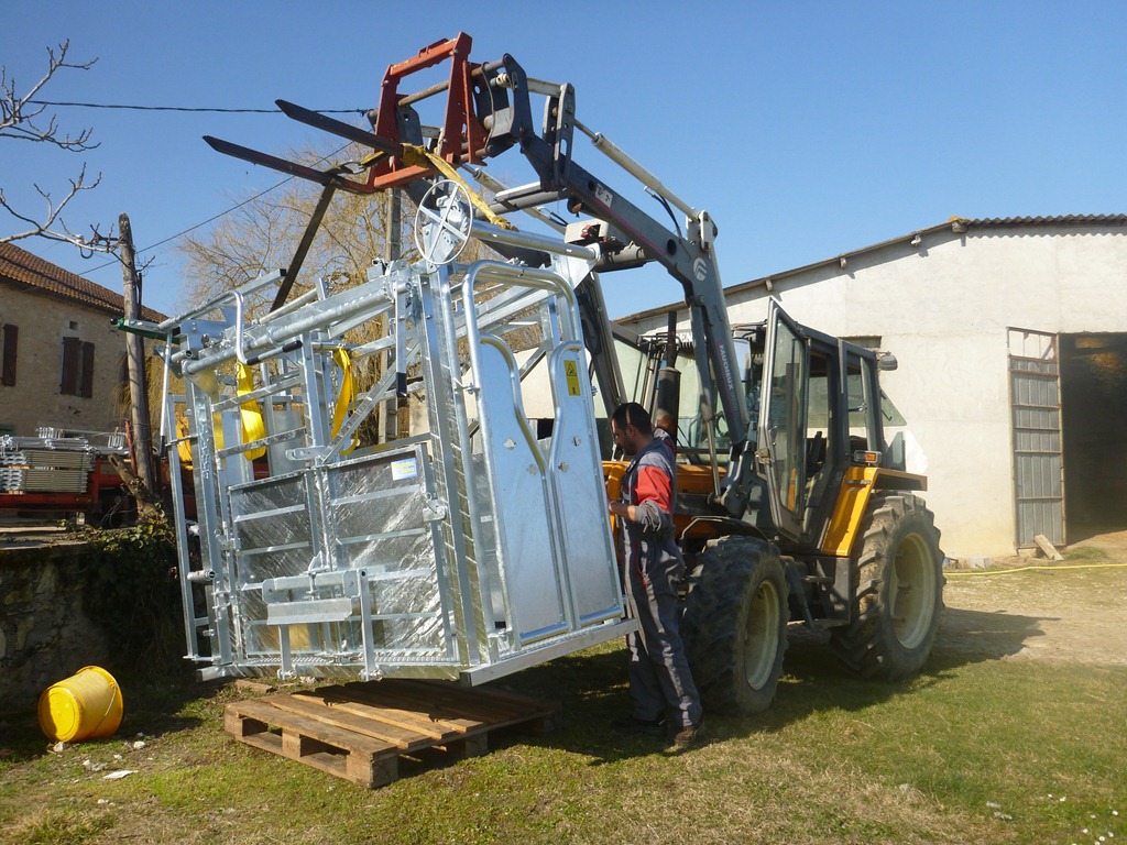 Getting the material off the low loader means putting the pallet forks on the tractor. Rev the engine to get the power in the hydraulic system and lift the half ton cage. It is all shiny with its zinc coating. That won’t last – it will soon get plenty of wear and tear.