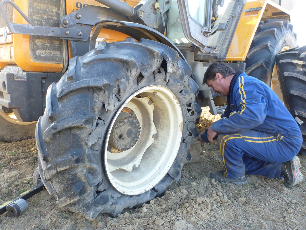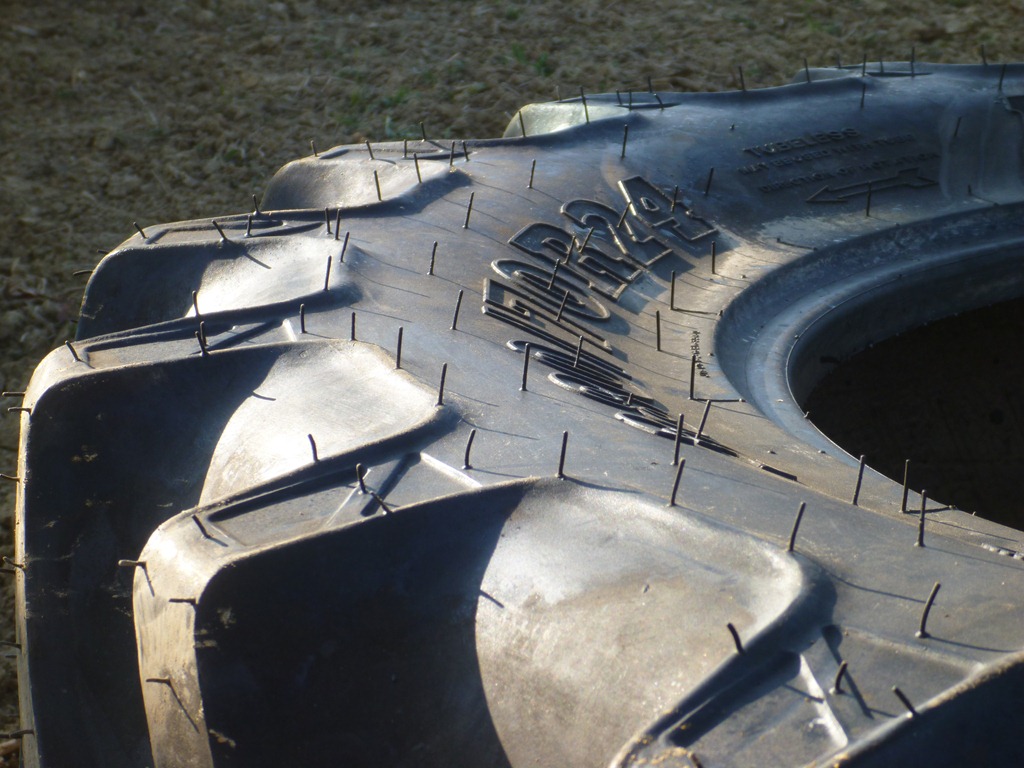 I was just about finished rolling the Nebraska paddock with the cultipacker when the tractor lurched to the left and started sliding sideways down the hill. Ah, a flat. My bicycle puncture repair kit wasn’t up to this job.