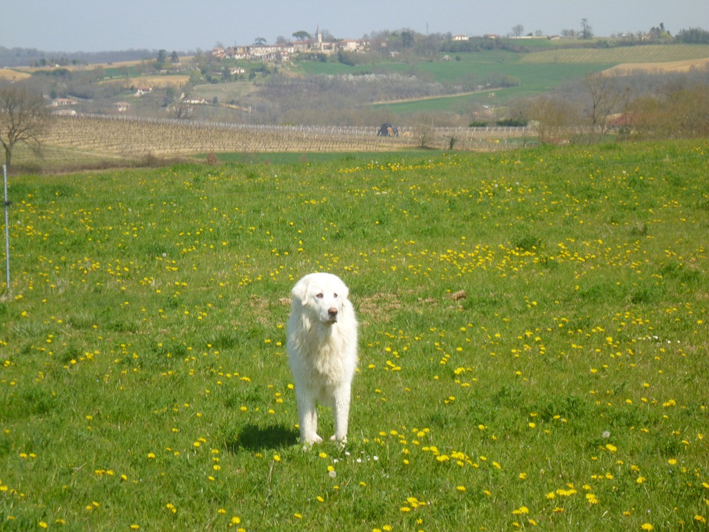 Dandelions, a patou and Roques. A patou des Pyrénées is a Pyrenean Mountain Dog (or Great Pyrenees) and Legend is one of those. He’s about one year old now and big and puffy. He likes to keep watch for intruders.