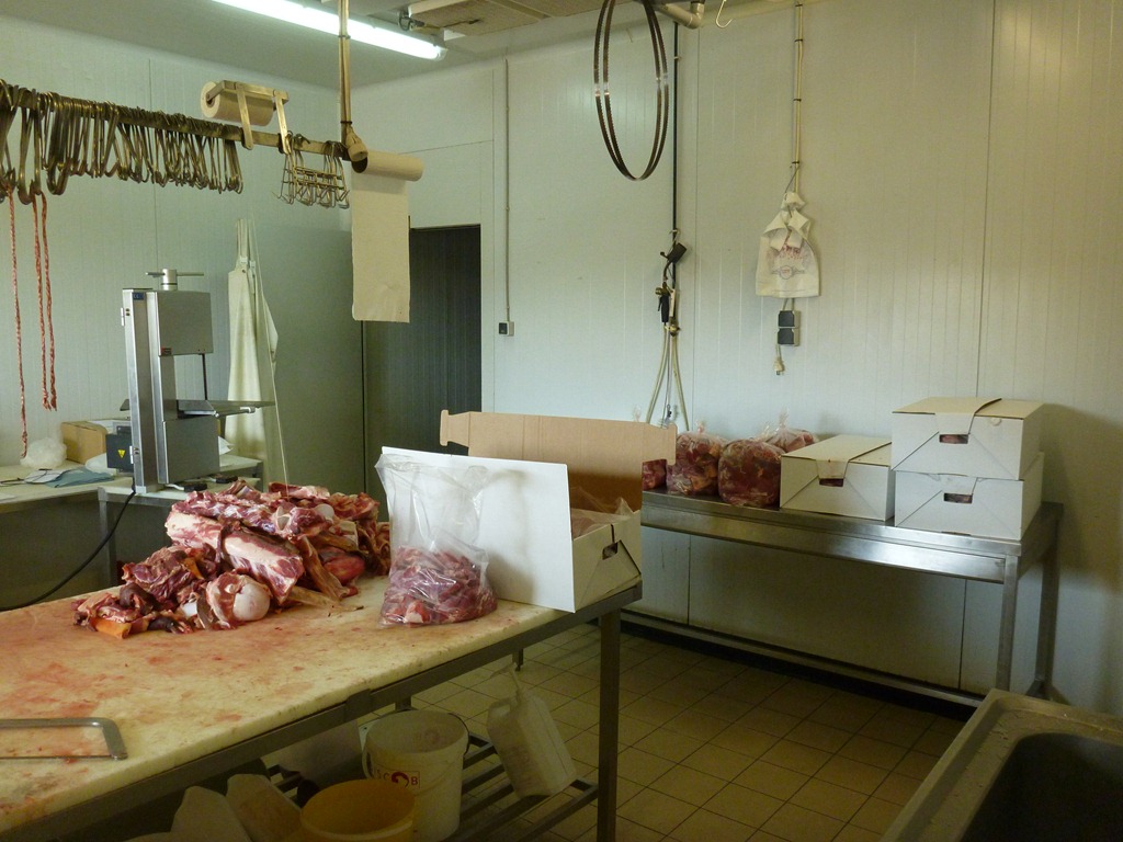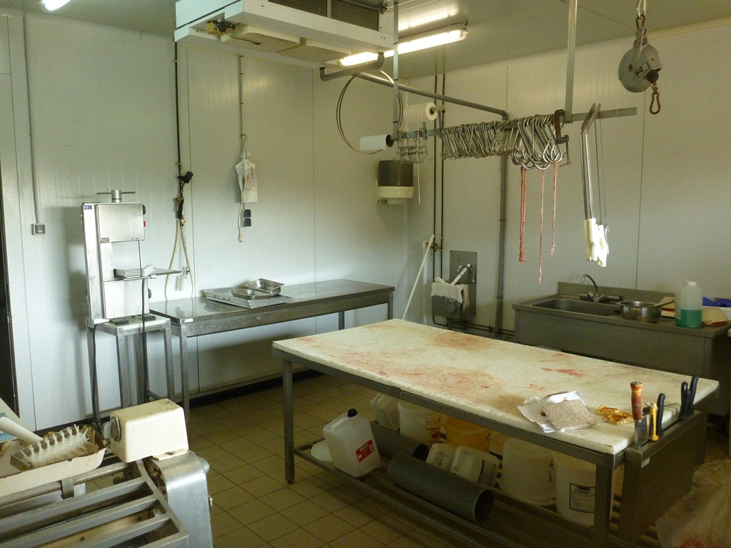 Here’s the local butcher’s room. Not too fancy but nicely equipped. That band saw on the left is useful.