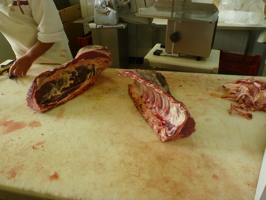 Splitting it into two give you rib-eye steaks on the right and t-bones on the left, or you can split the t-bone into its constituent parts. We decided to keep them as t-bones just for fun since you can’t find them in France.