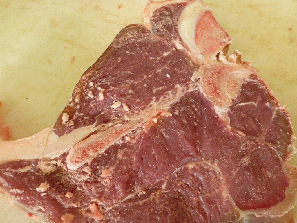 The meat has a little marbling, but not where the older animals will get to. The bits of fat sticking to the meat on the t-bone below come from the marrow in the bone, some of the best fat there is. Maybe you remember eating the marrow as a kid. I certainly did.