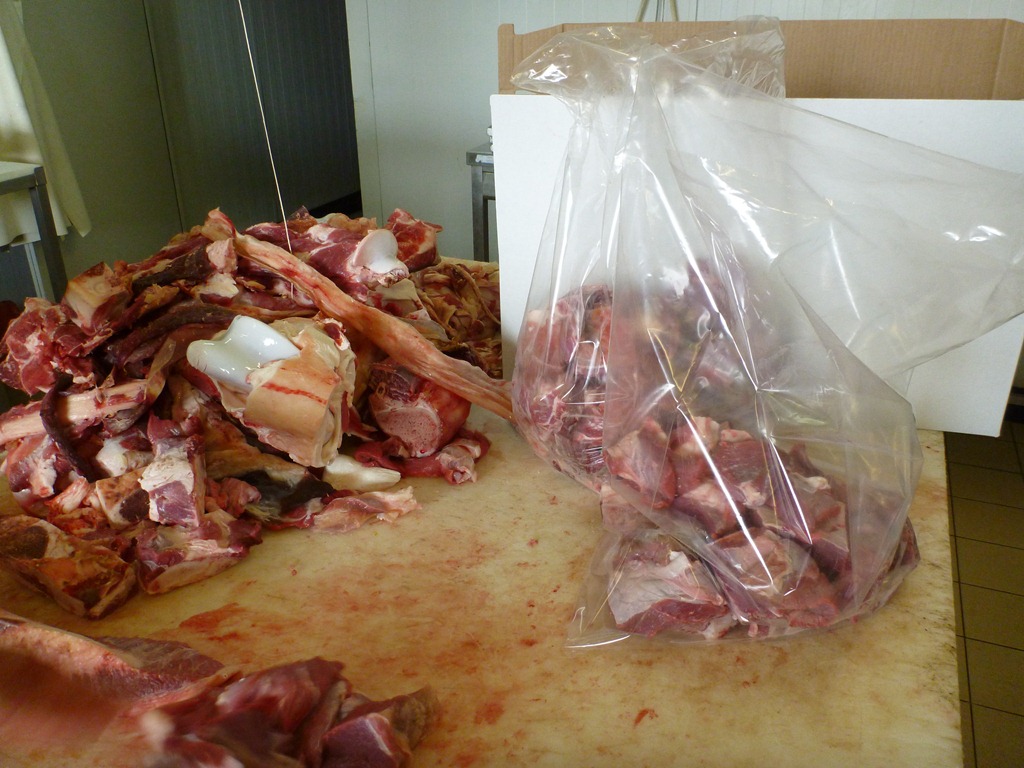 Filling up big bags for flavorful stew meat. The bones and scraps on the left will go some very happy farm dogs.