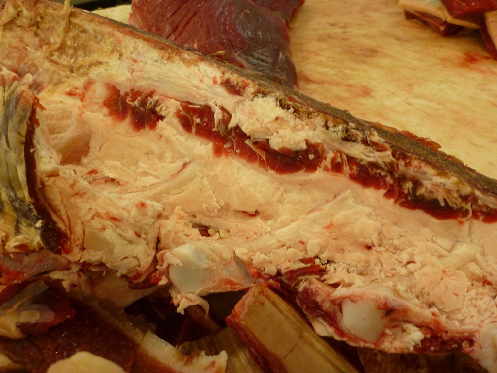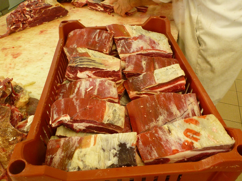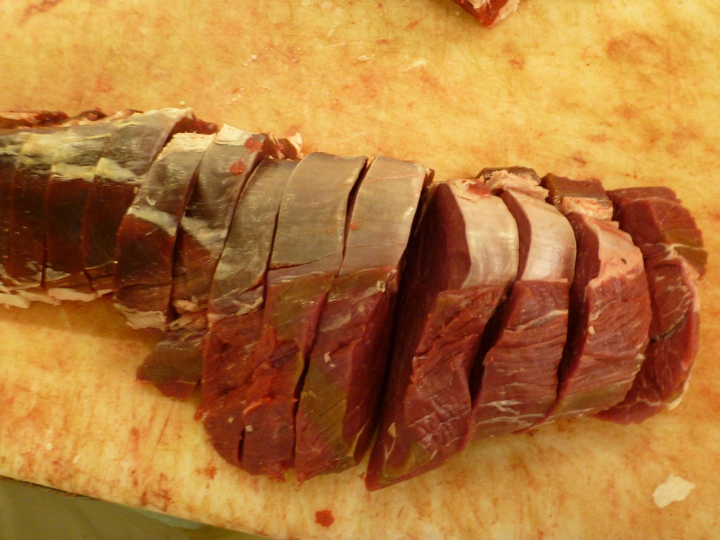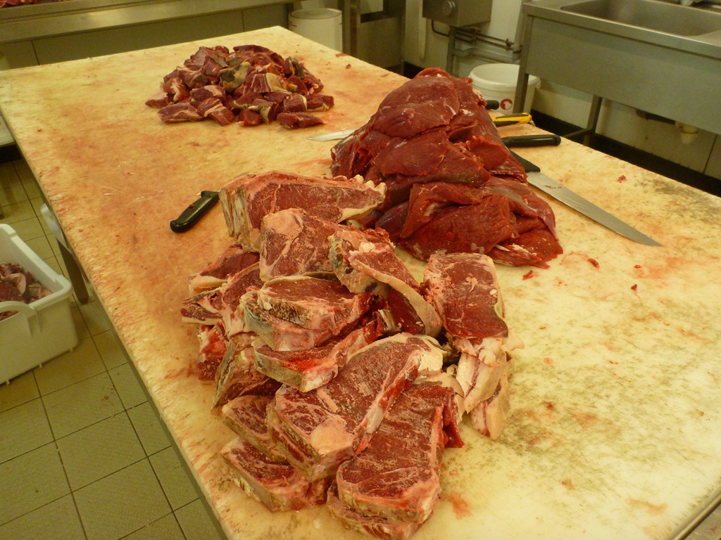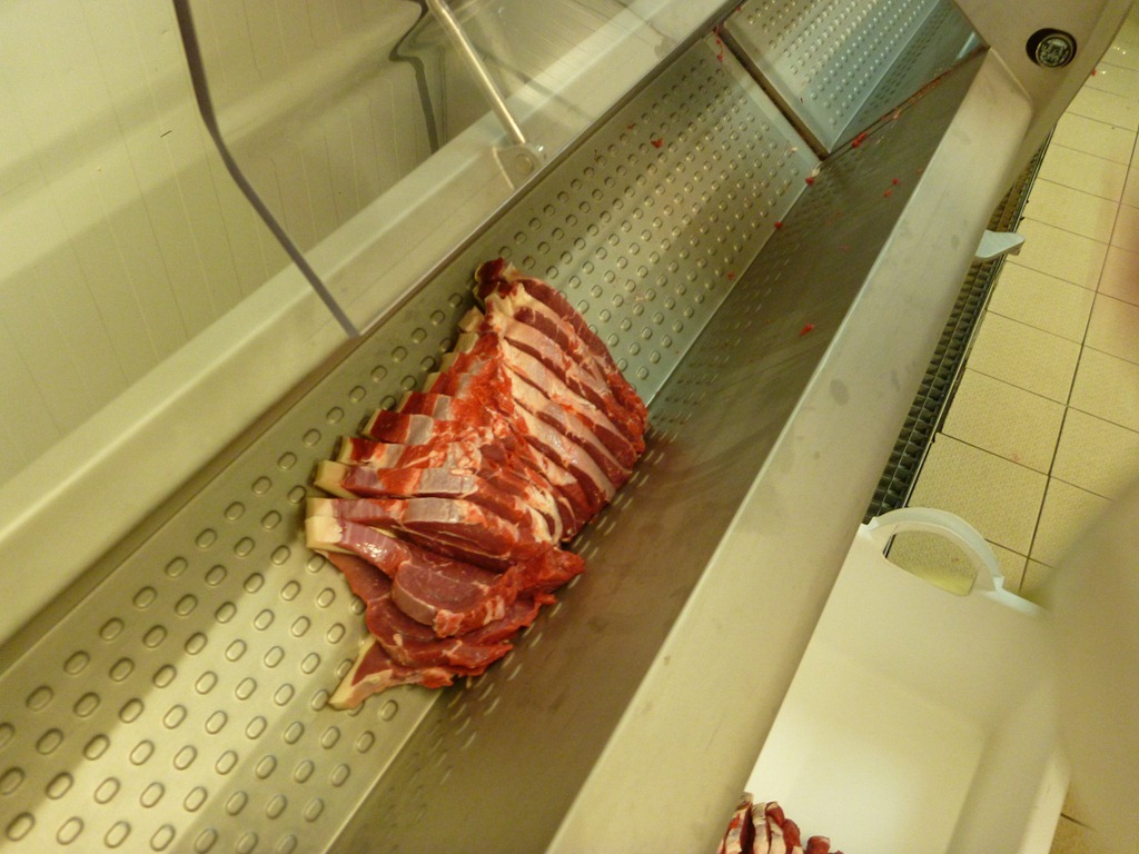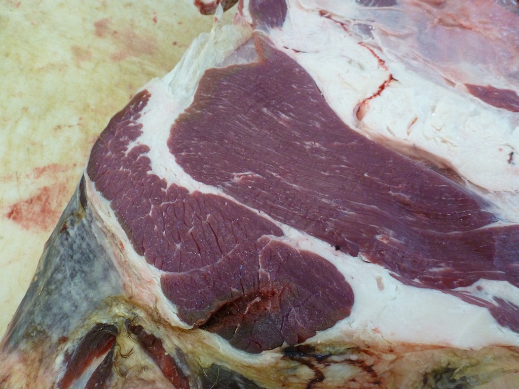 I had a hard time getting the white balance right on the camera but I think this shot is closer to reality. Just like the young bull, the grass-fed meat is darker than the cereal-fattened beef the butcher usually uses. This one was aged 23 days which gives its surface a different look to a younger carcass.