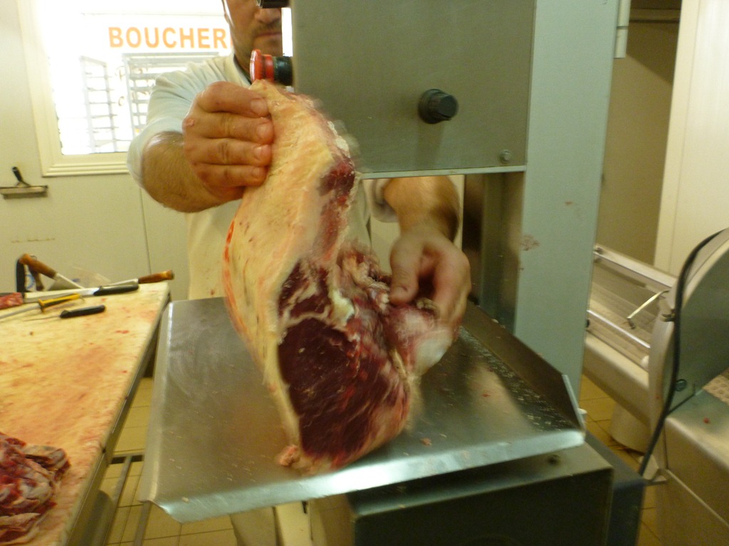 The band saw is used to clean up some of the bones off the faux filet, although I’ve also heard it called other names like entrecôte, Porterhouse (in the UK – in the US a Porterhouse has the tenderloin on the other side like a giant t-bone), sirloin, NY strip and so on. Everywhere you go people call this awesome cut by a different name.