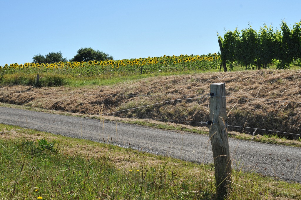 This is border fence done the Gascon way with cut down old acacia vine posts and two steel electric wires. To be hard core the post would be about half the thickness, falling over and would only have a single wire, but we like to sleep at night. Behind are the sunflowers of one neighbor and the vines of another. You can see the single-wire perimeter fence in between.