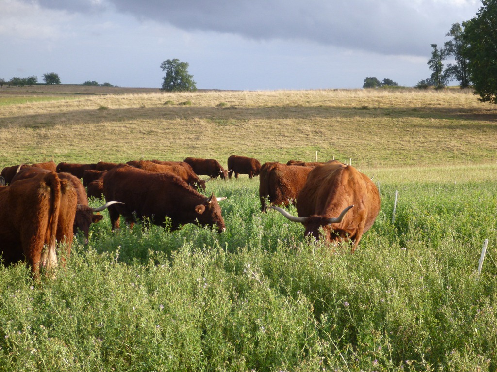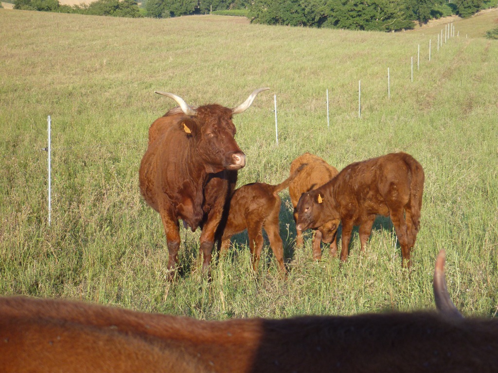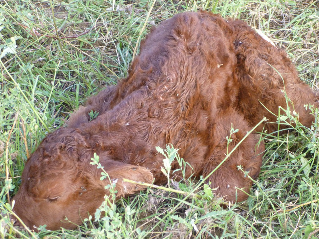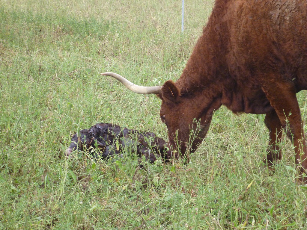 He’s a male calf (veau vs. velle). I gave him a little pat and Mom didn’t spear me. She was taking a break from the rigors of birth by going for a munch while he dozed. This is about the only time you can get close to a Salers calf. After this the mother cows get very protective.