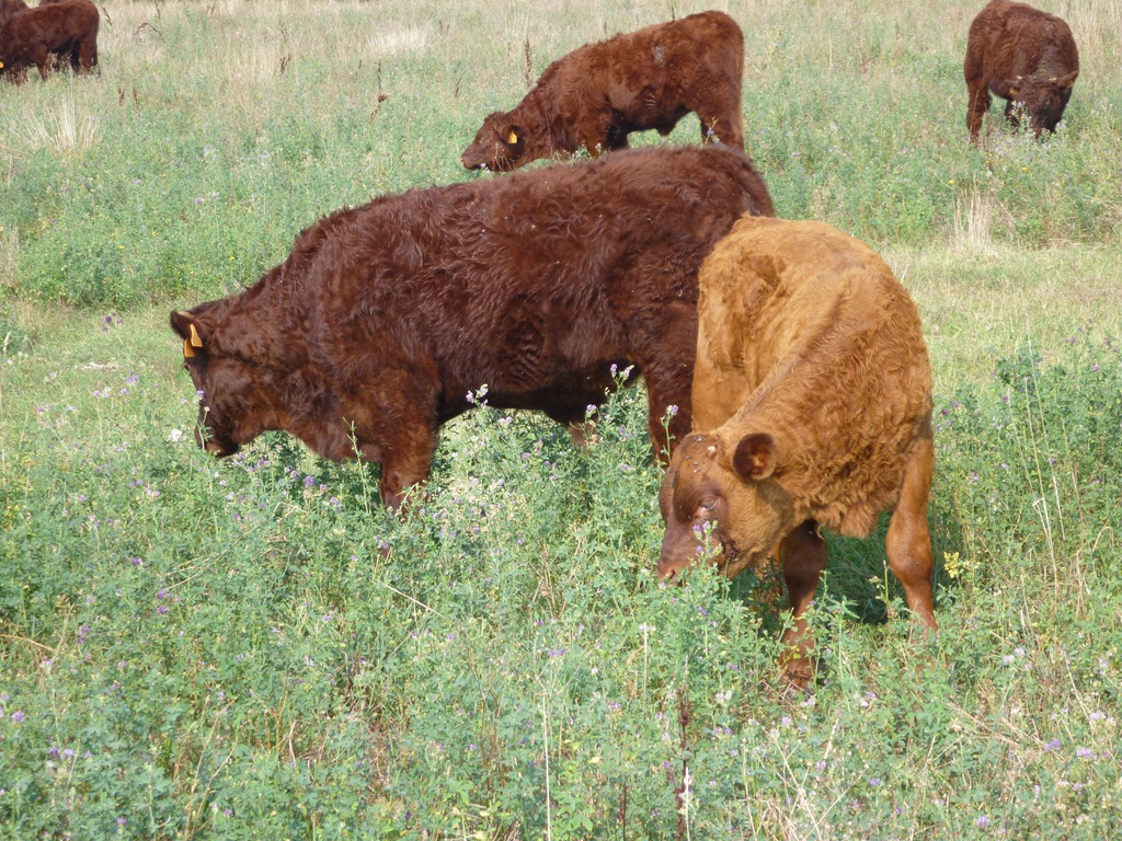 I think Huggy Bear is a cross. He’s lighter than all the other animals in the herd and his face has a grading of color which I’ve never seen on any other Salers. His mother (Old Girl) was pregnant when we bought her and maybe the neighbor’s Charolais or Blond bull got in.