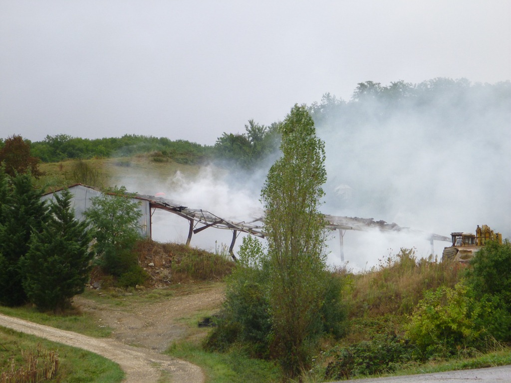 The barn fire is smoking and the emergency services are there. Maybe it flared up again? Maybe it burned for two days?