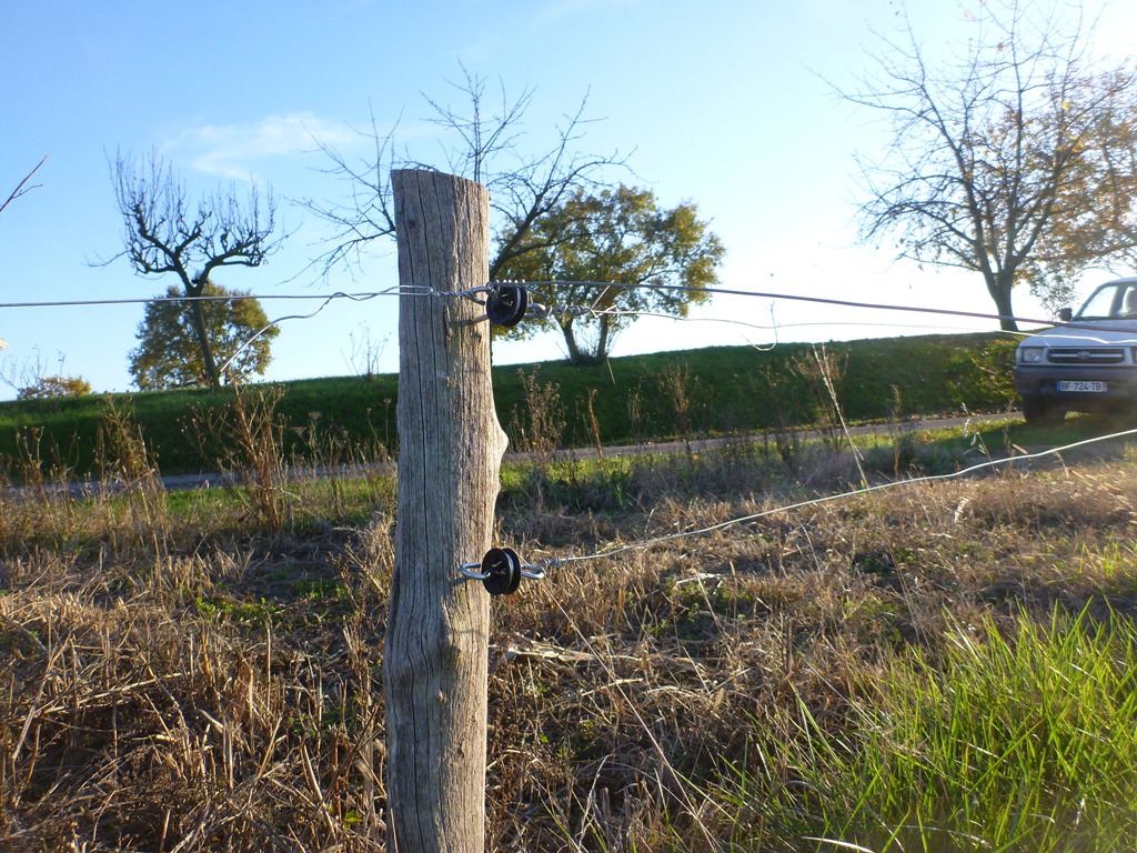 Now any posts still with a vague point get a second life as a fence post. This is one I’ve wired up to be one side of a simple wire gate with screw-in metal thingies to anchor the wire and insulate from the post.