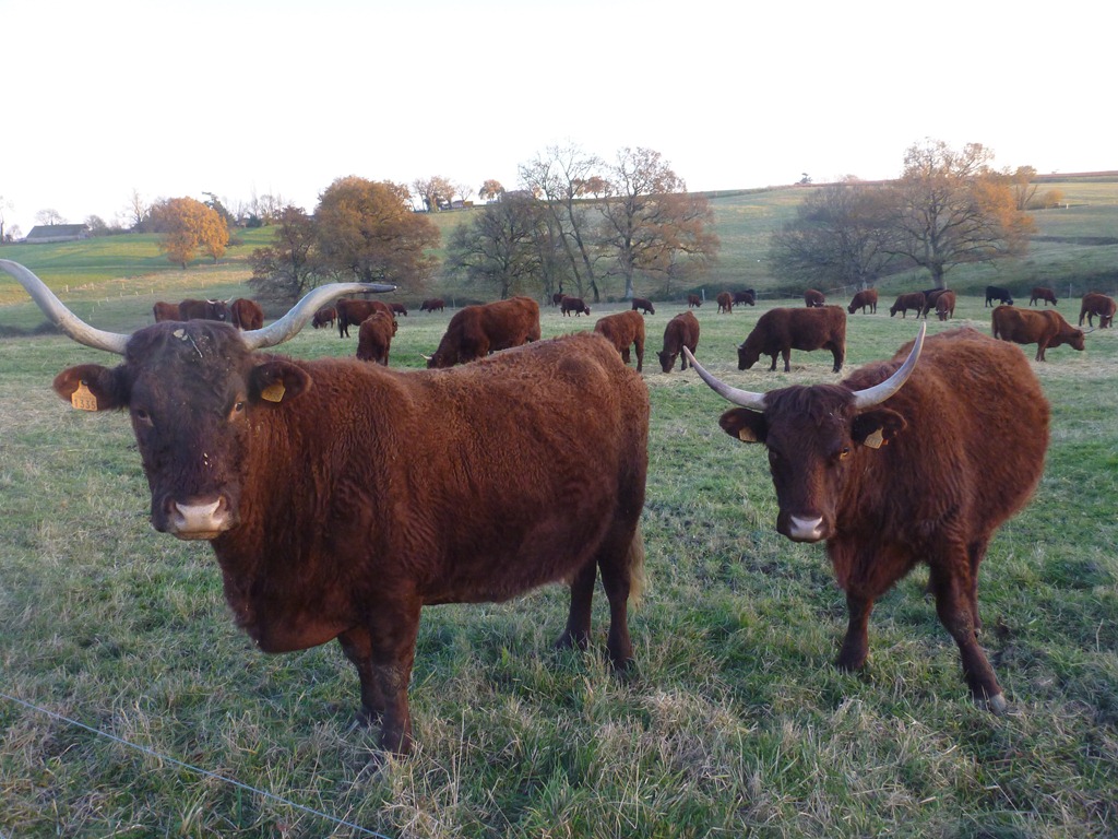 Hey Auntie Iza. All French cows have horns, unless they’ve been dehorned. Few herds are dehorned, although I have seen one or two where they cut the horns back to a few inches. We’re thinking of doing it for human safety in the yards.