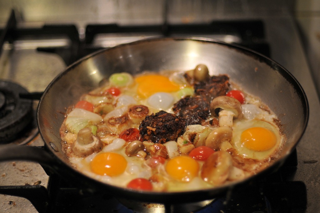 Mushrooms, leeks, eggs, tomatoes, garlic, leftover pork sausagey bits and a large chunk of lard. Served with salt, pepper, crème fraîche and some Tunisian chili paste.