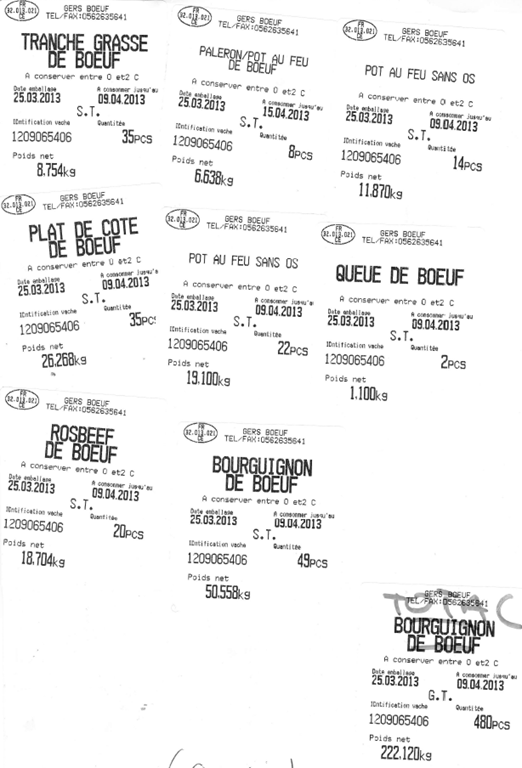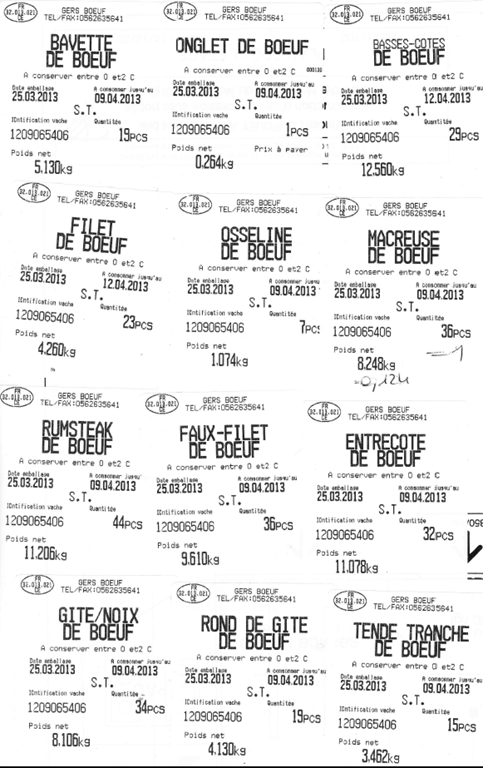 When we pack and pick up our meat the butcher gives us a page with a lot of printed stickers showing how much of each cut the cow gave. Translations here.
